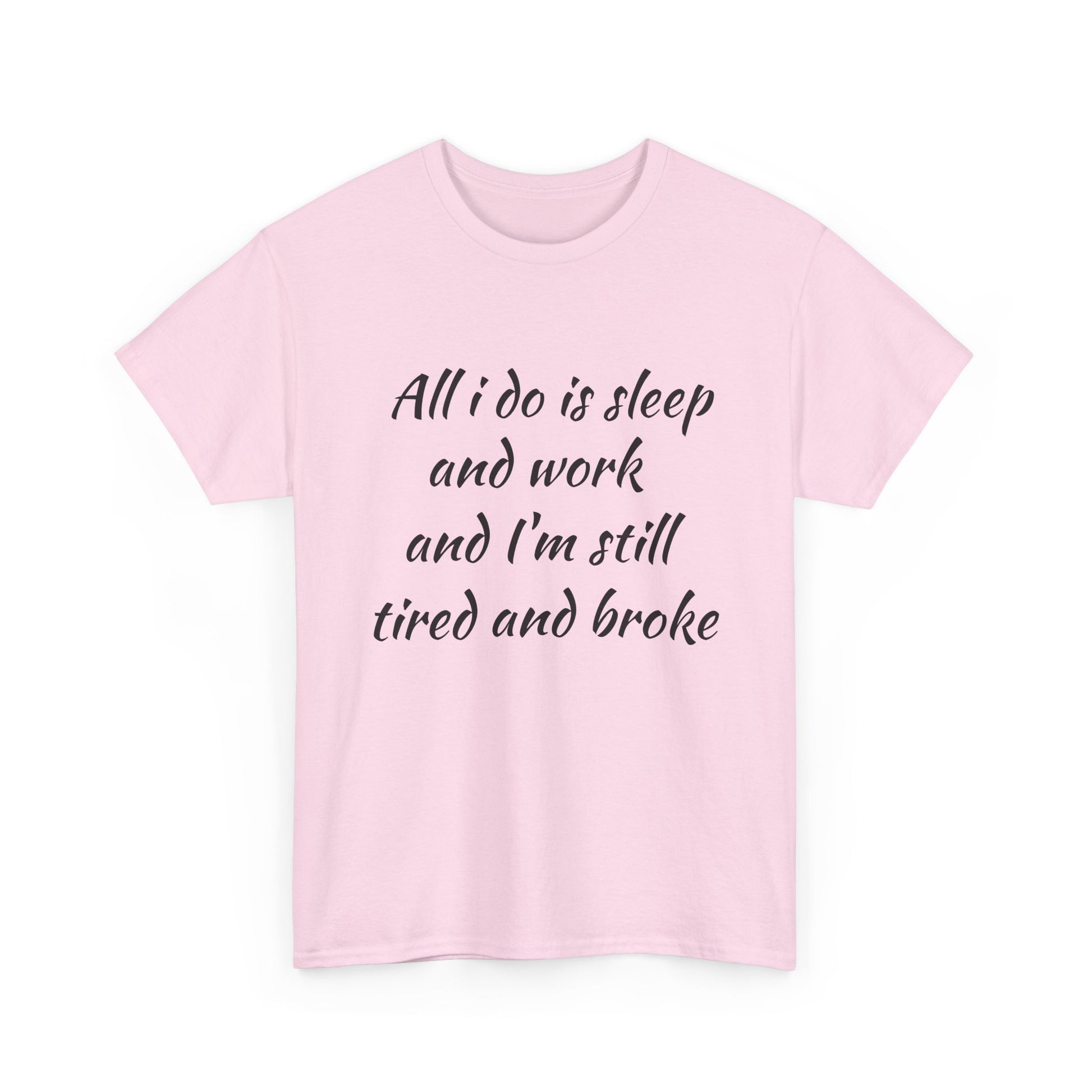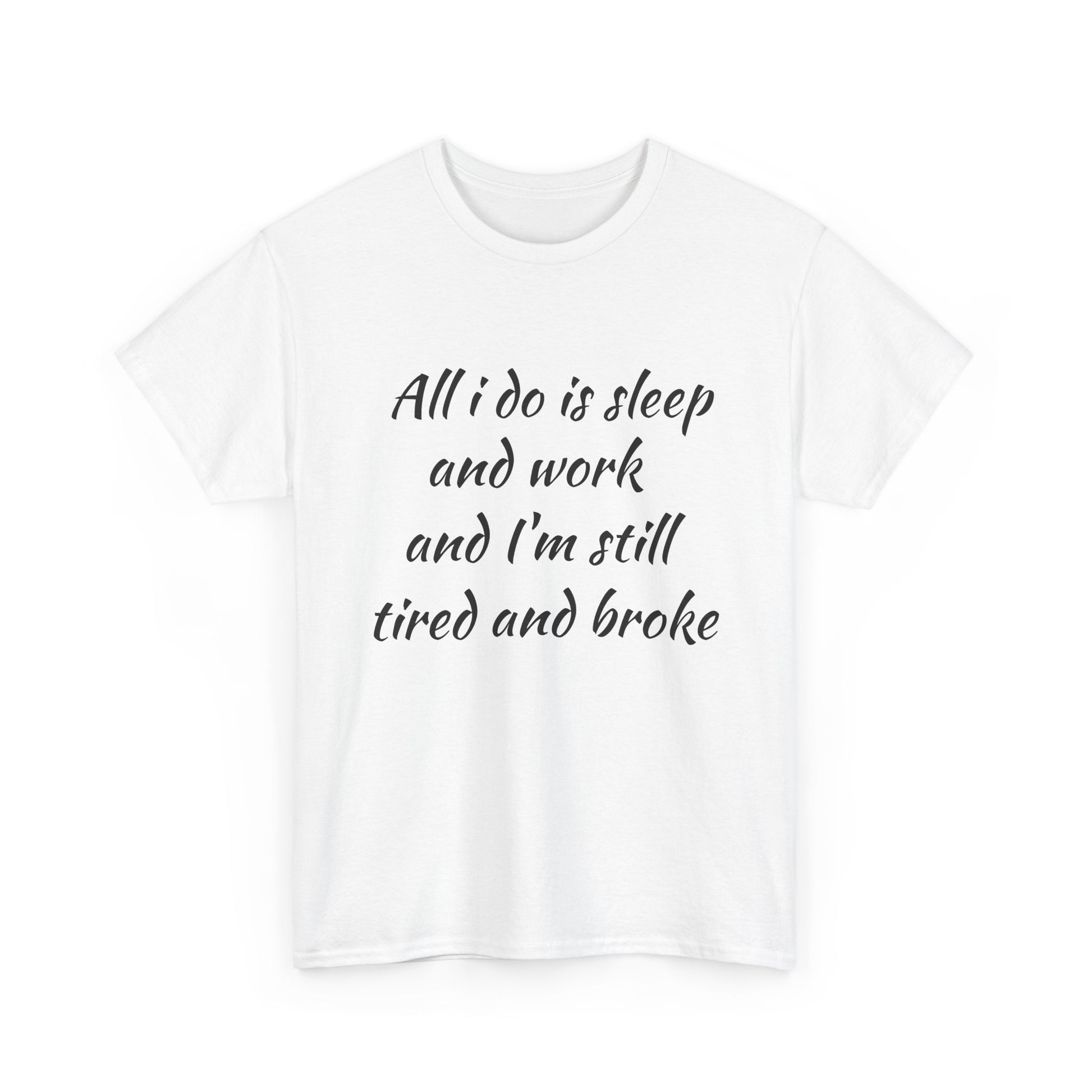 Camiseta gráfica: “Todo lo que hago es dormir y trabajar, y aun así estoy cansado y sin blanca” con diseño de espalda de Lobo Loco