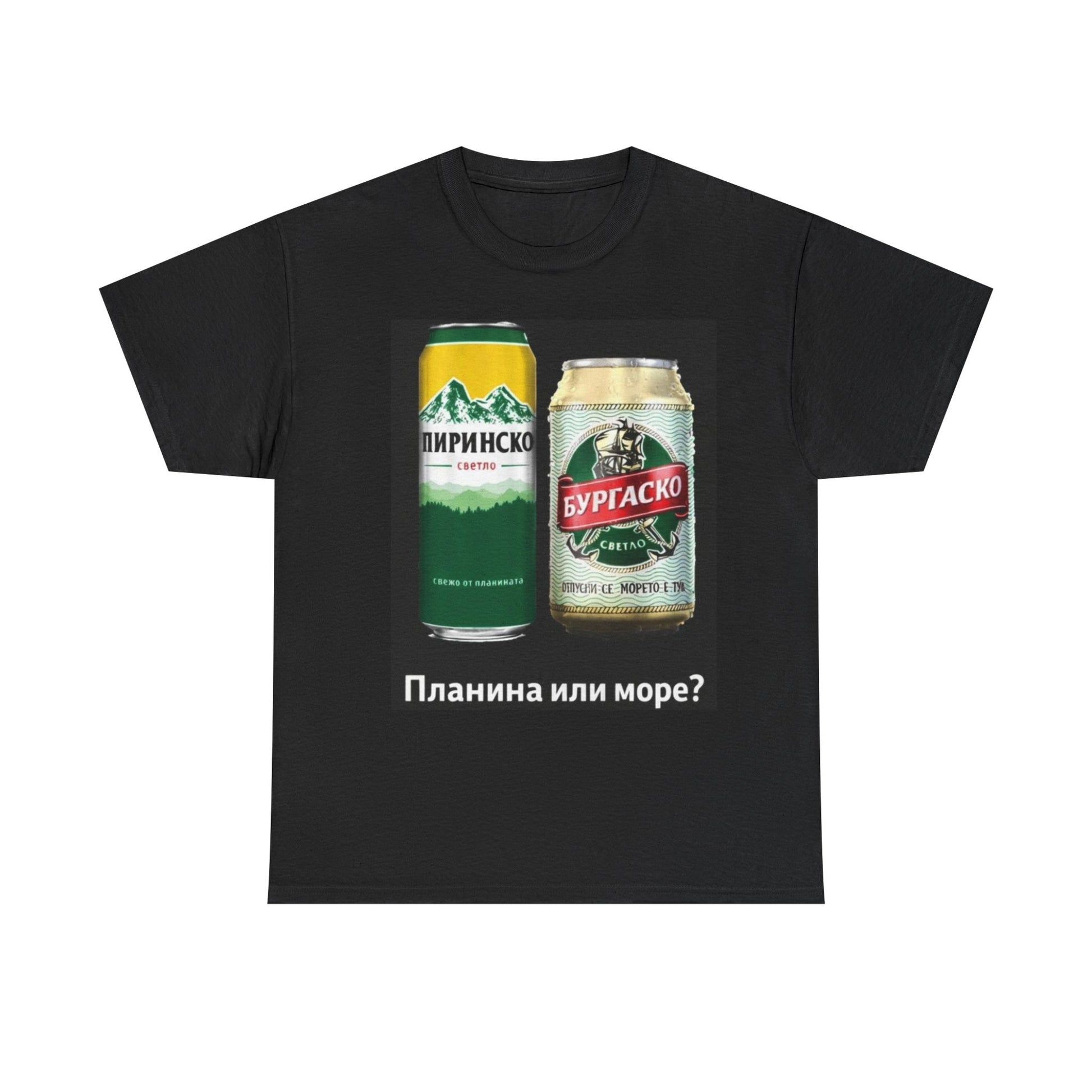 Camiseta — "Планина или море?" Diseño de latas de cerveza