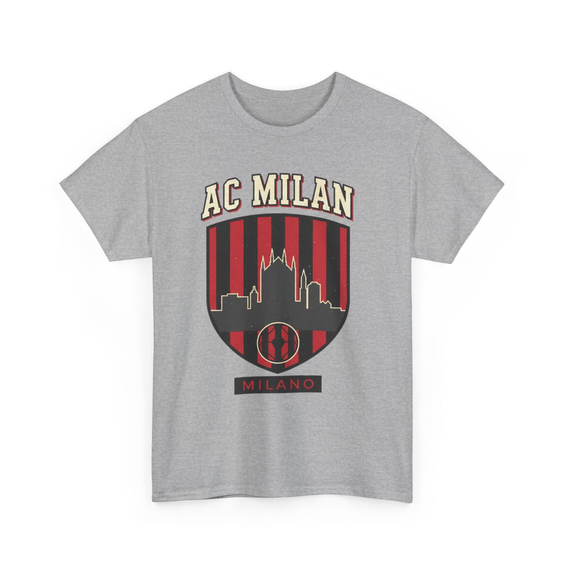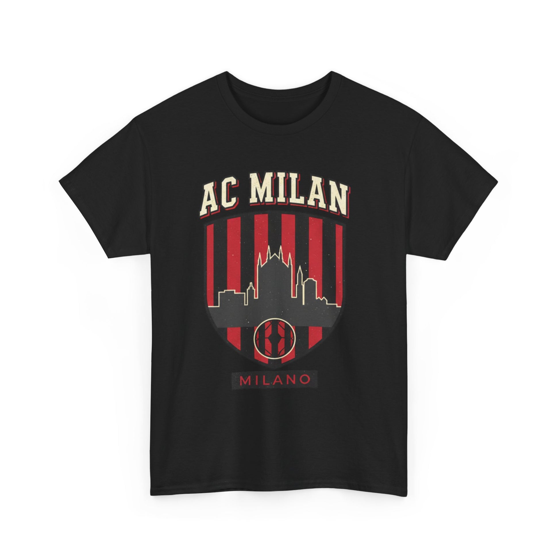 A soft, classic cotton tee with a bold, vintage-inspired Milan crest on the chest. The design layers black-and-red stripes with a skyline silhouette and retro lettering, giving this shirt an old-school supporter vibe. It sits relaxed on the body, breathable and sturdy for everyday wear — great for cheering at a match, wandering city streets, or meeting friends at a local bar. The crew neck and tubular knit body keep the shape simple and clean, while the printed inner neck and sleeve details add a subtle, modern touch. This tee feels lived-in from the first wear and ages with character, carrying a quiet pride in place and sport without shouting for attention.