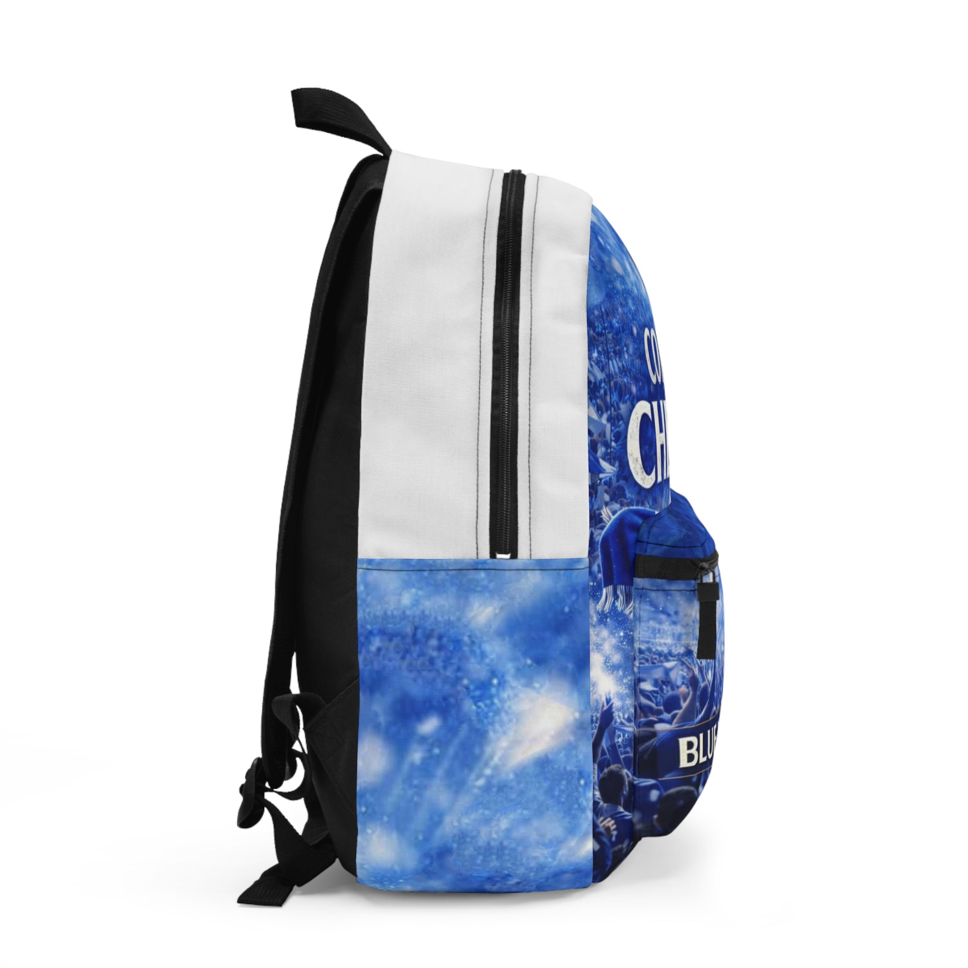 Blue and loud — this backpack carries the energy of match day wherever you go. A vivid crowd scene and bold “COME ON CHELSEA” lettering sit beneath a sky of celebratory blue, so your support is visible from the street to the stands. The padded mesh back and adjustable straps keep you comfortable through commutes and long days. Multiple zip compartments, a dedicated laptop/tablet sleeve and a side bottle pocket keep gear organized and easy to reach. Lightweight polyester means it stays shaped and dries quickly after rain-soaked journeys or post-game commutes. The sewn blank name tag inside makes personalization simple, and visible dashed guide lines in the front pocket interior are a small reminder this is a crafted, cut-and-sew piece.